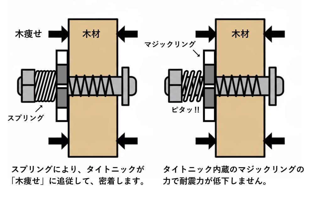 ネストでは、そうした事態にも対応できるよう、一棟あたり数百個使用するすべての金物に独自の工夫を凝らしています。スプリングが内蔵された「タイトニック」という特殊な金物の働きにより、木材が痩せたり地震が起きたりしても、金物が木材にしっかりと密着し続け、耐震性能が低下しない構造になっています。普段は見えない細部にまで、確かな安心を追求しています。